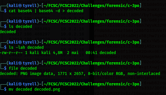 En fouillant un peu (par chance je l'avoue sur ce challenge), on tombe sur un stream TCP qui contient un gros base64.