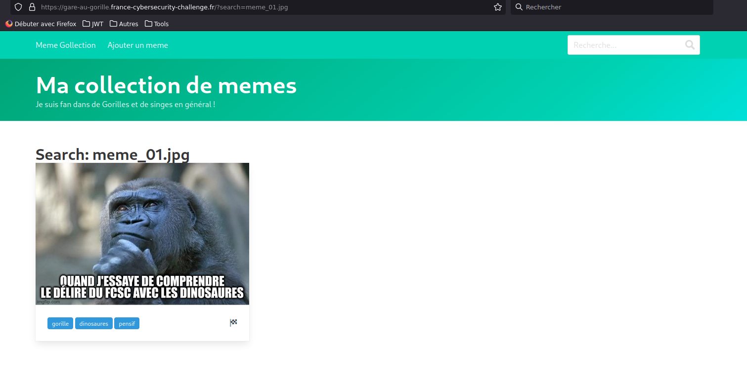 https://gare-au-gorille.france-cybersecurity-challenge.fr/report?url=/?search=meme_01.jpg. On a une variableurlqui contient l'URL de la recherche de l'image.
